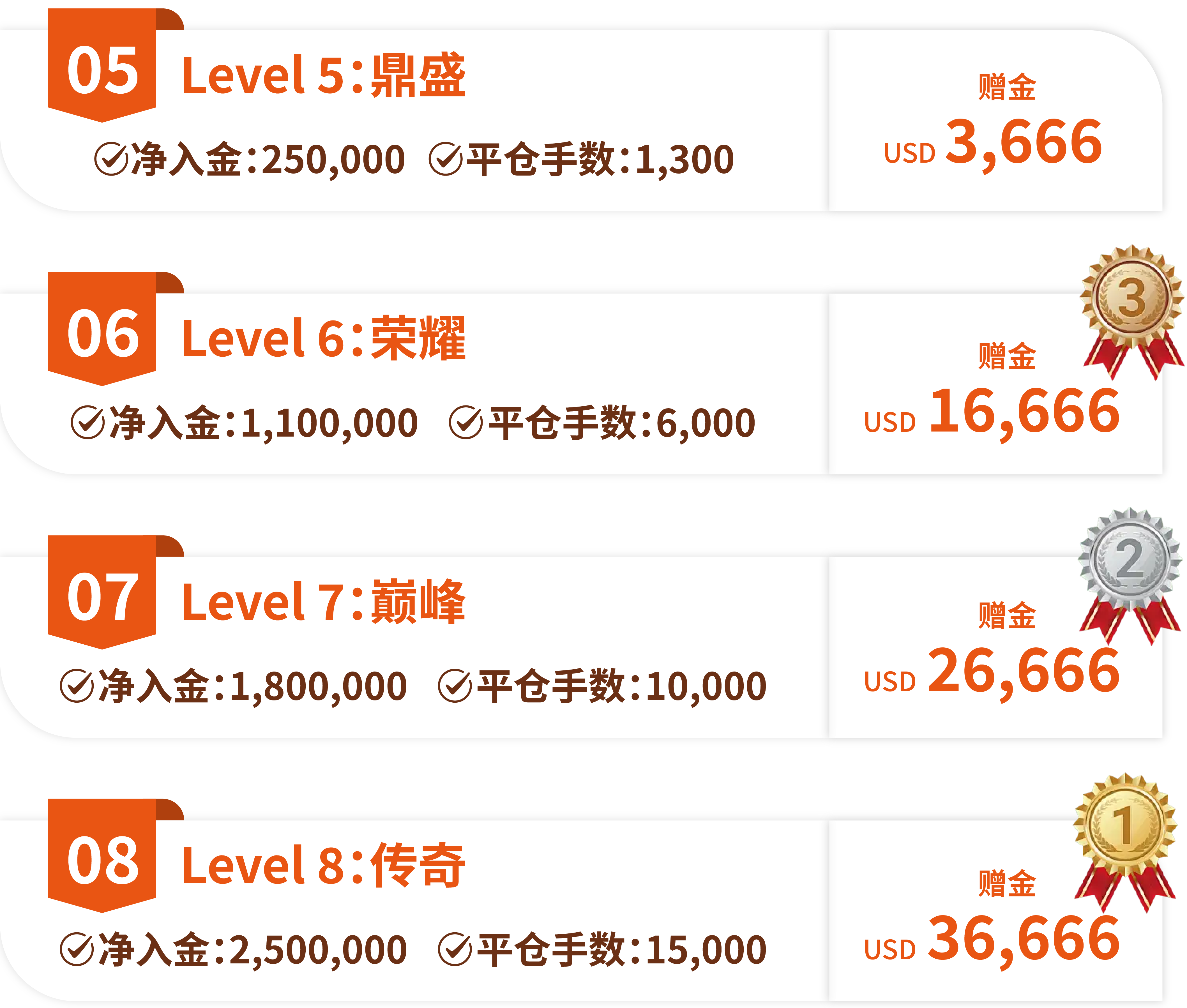 从启航到传奇,八大层级逐级解锁!活动期间内,达成指定净入金与平仓手数,即可解锁对应层级赠金奖励,最高可享 $36,666赠金回馈。