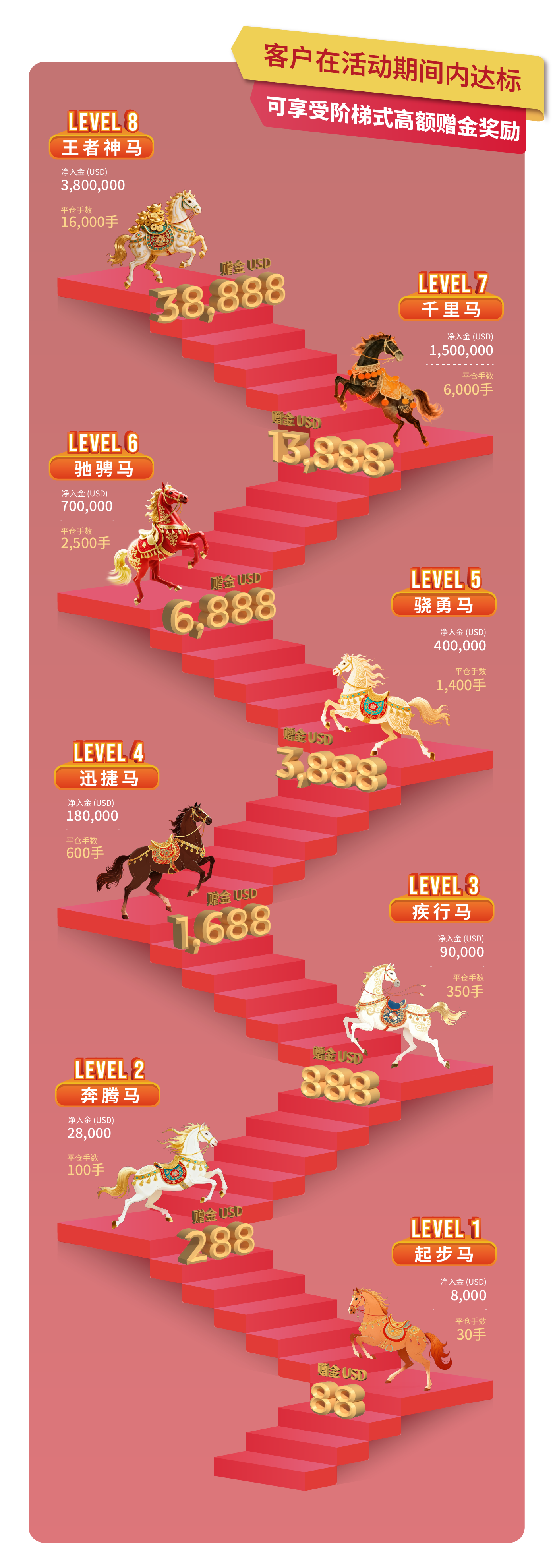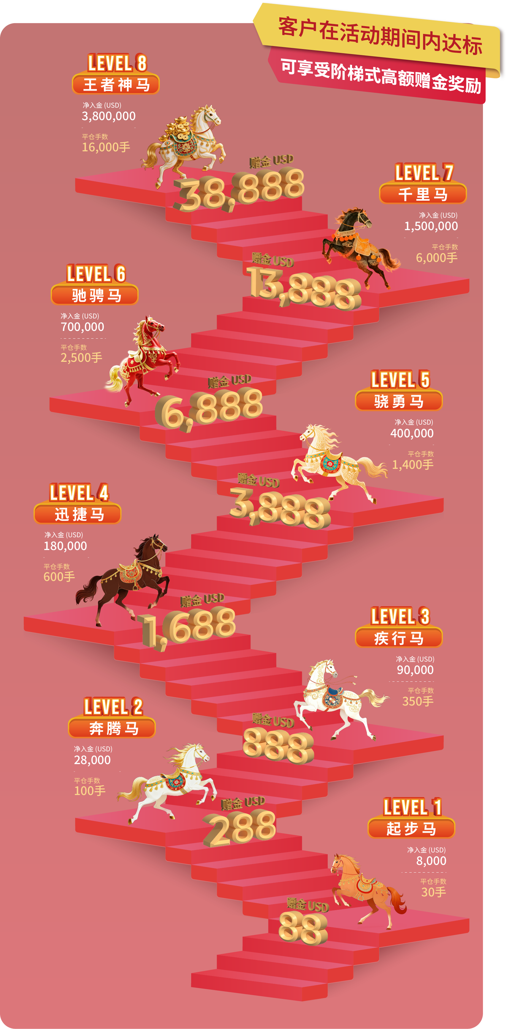 • 活动内容:客户在登记活动后,活动期间内的净入金和平仓手数(美股产品不计算在内)达到相应要求,即可获得该层级对应的赠金。