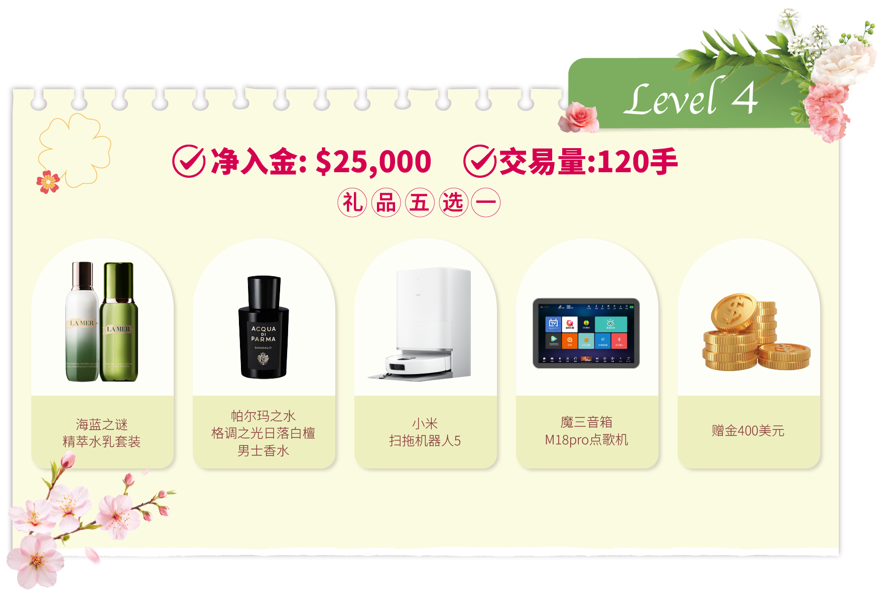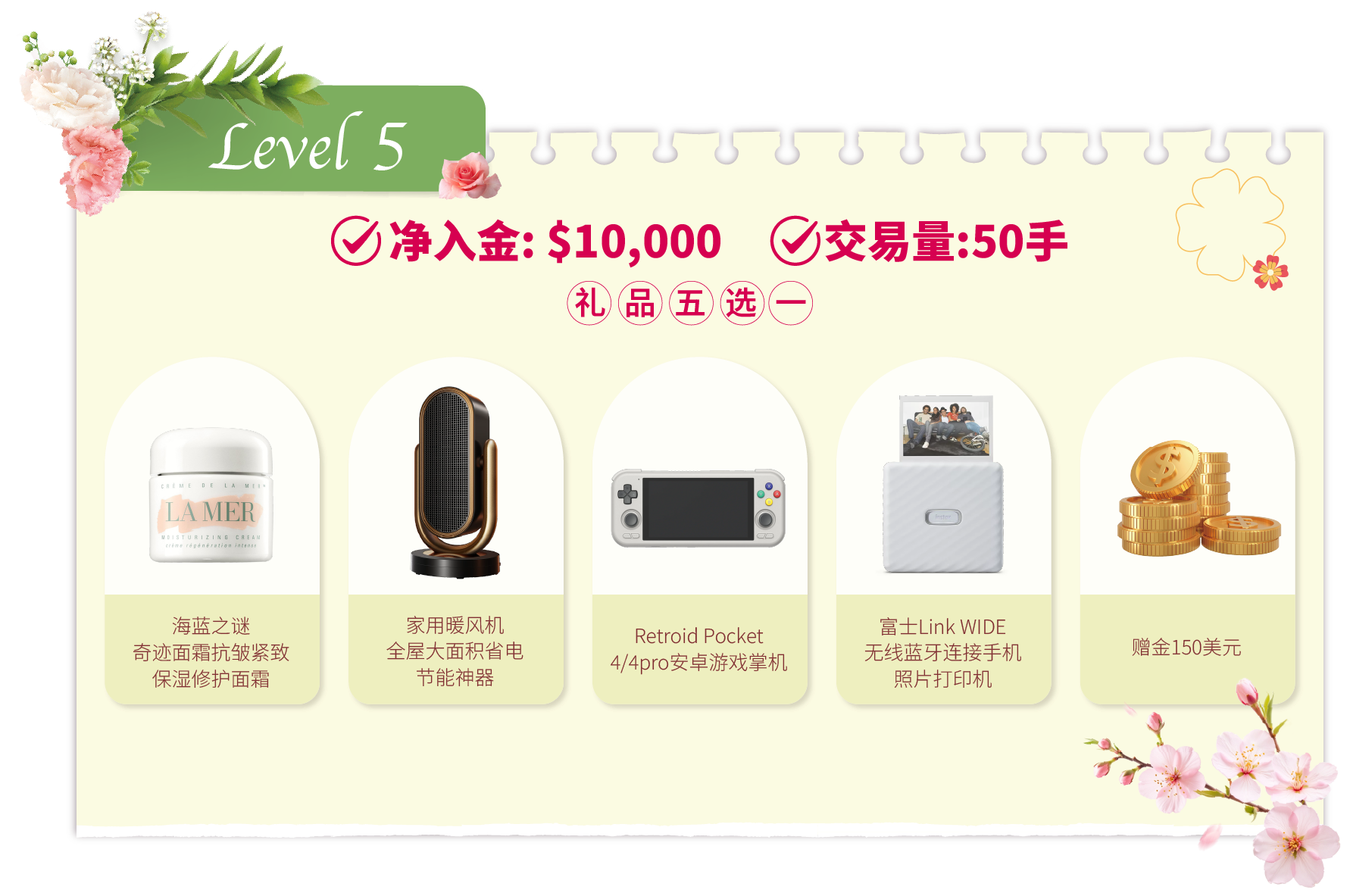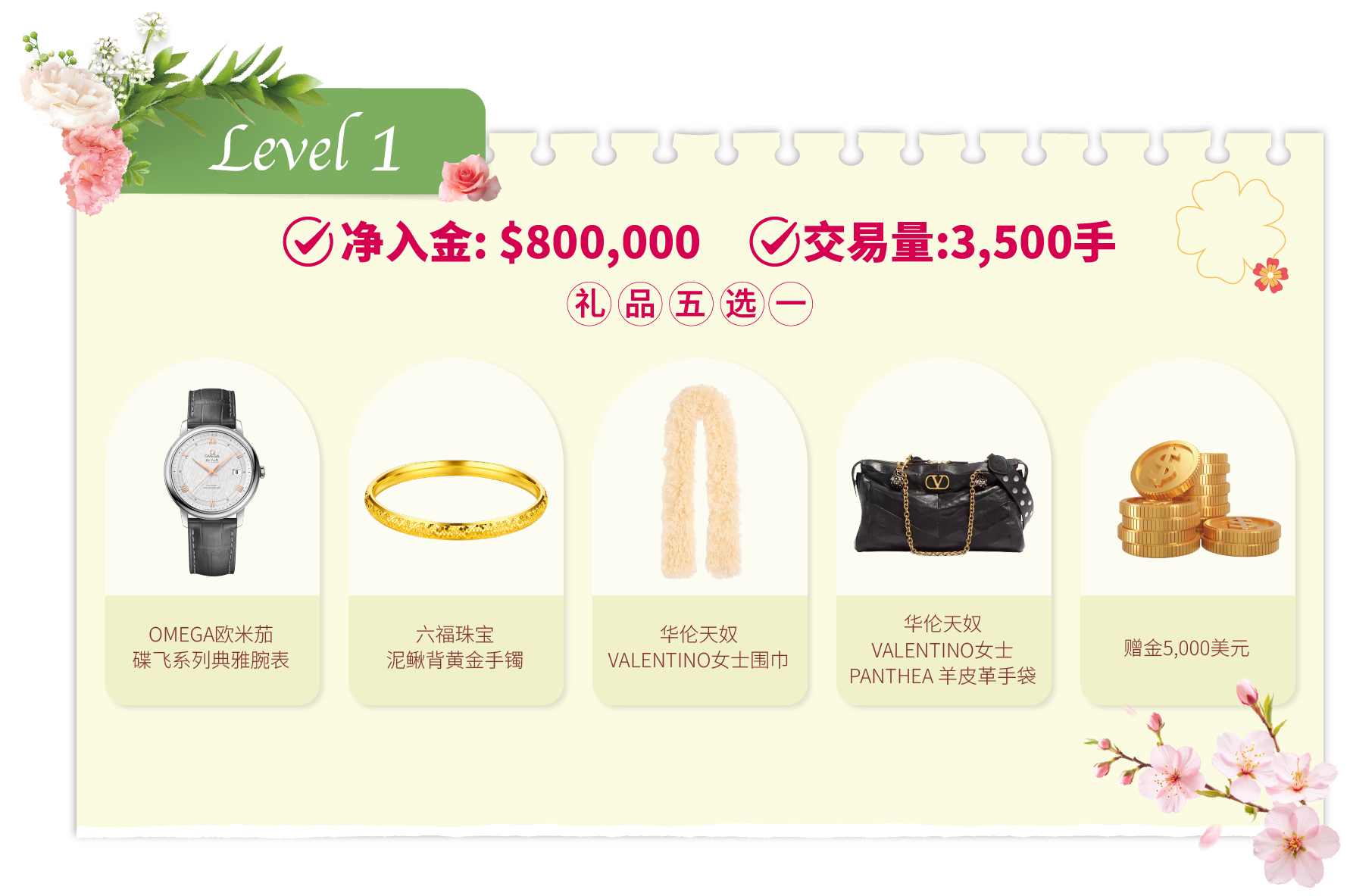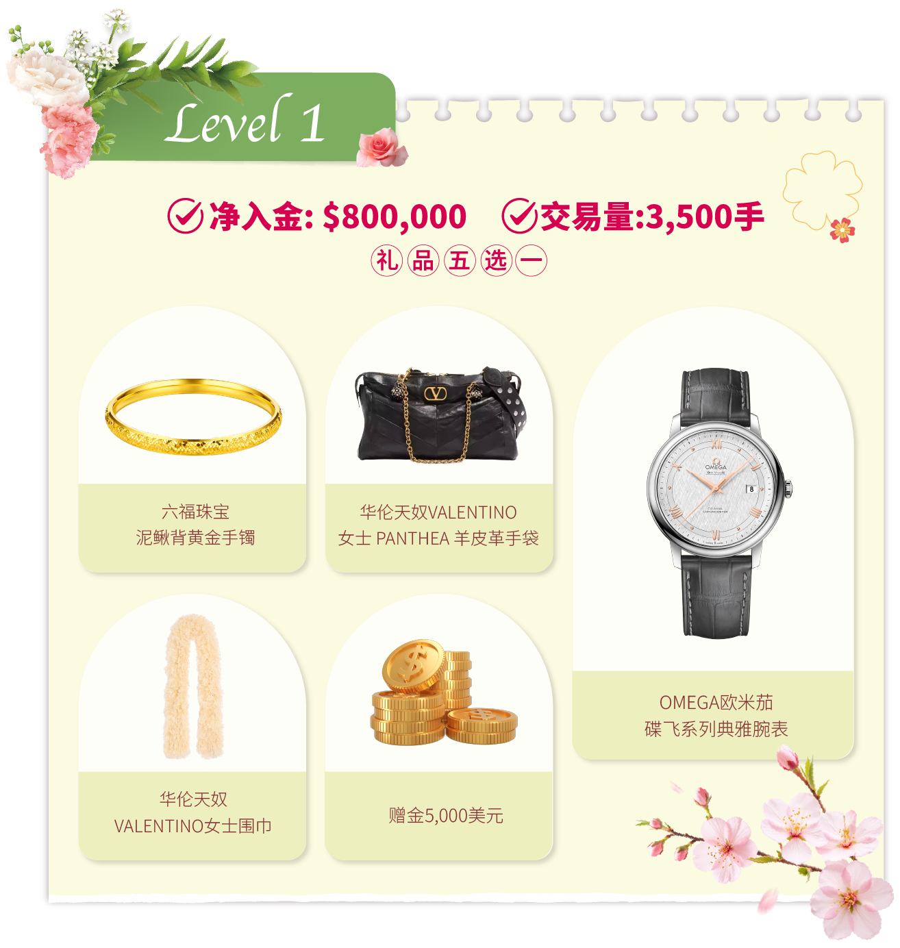 在活动期间内,客户的净入金和平仓手数(美股产品不计算在内)达到相应要求,即可在该层级的五件精选礼品中任选其一。若通过亨达APP完成交易,平仓手数将享有三倍累计计算,助您更快达成目标!